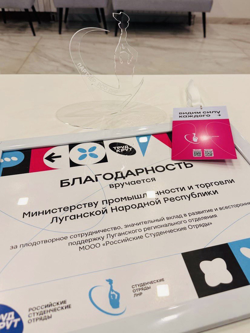 Минпромторг ЛНР получил Благодарность за поддержку студотрядов.
