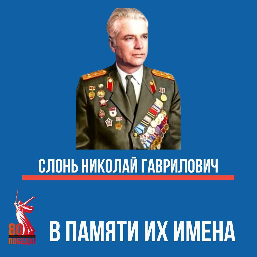 Данные из учётной картотеки 03.06.1944: «Расчёт старшего сержанта Слоня, занимавший позицию на высоте 137,0, вёл огонь прямой наводкой. Неоднократные попытки противника атаковать были пресечены метким огнём, заставлявшим врага отступать. Из своего орудия расчёт Слоня уничтожил до полутора десятков вражеских солдат и офицеров, а также подавил пулемётную точку. Когда противник в третий раз пошёл в наступление, и из-за нехватки боеприпасов смог занять соединяющие траншеи, старший сержант по приказу командира батареи поднял свой расчёт в контратаку. Благодаря их отваге, враг был выбит из траншеи. В ходе этой схватки лично старший сержант уничтожил четверых противников, захватил пулемёт и одного пленного. Несмотря на ранение, Николай Гаврилович остался в строю».