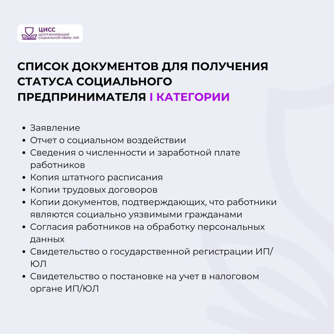 Необходимый перечень документов для получения статуса "социальное предприятие" I категории