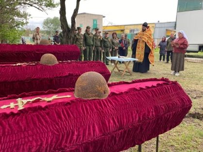 Под залпы воинского салюта останки Неизвестных солдат были погребены рядом с боевыми товарищами в братской могиле в Новоайдарском округе.