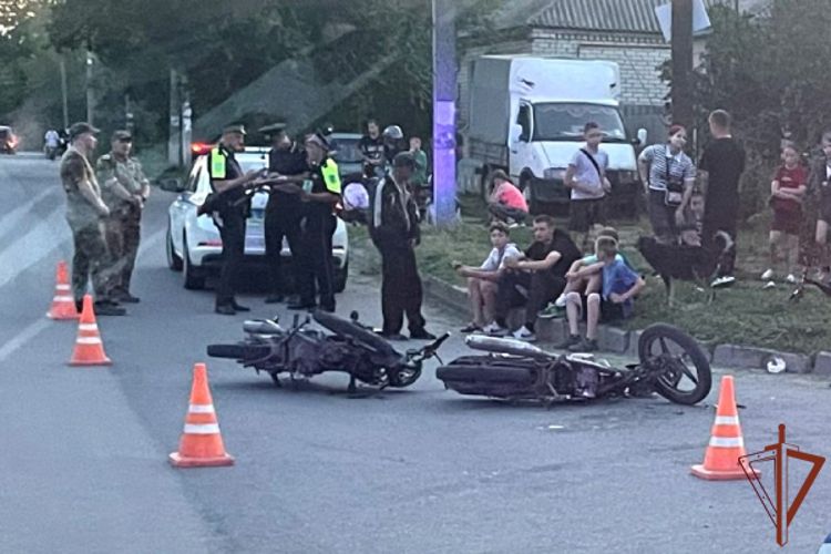 Первыми на месте происшествия, где столкнулись два мотоцикла, прибыли росгвардейцы – экипаж военной автомобильной инспекции и группа медицинской эвакуации.