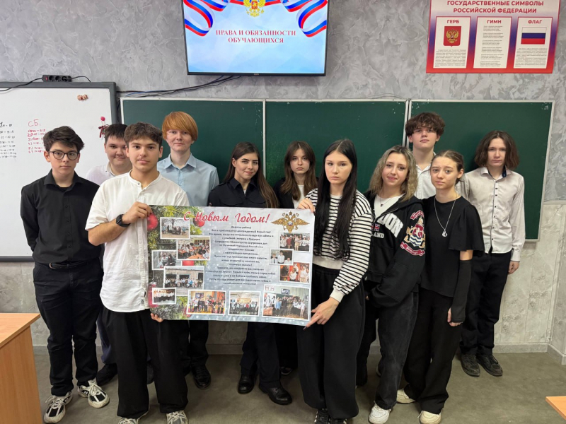На память о встрече и обучении в классе юридической направленности ученикам полицейского класса останется плакат с новогодним поздравлением от регионального Министерства внутренних дел, на котором изображены фотографии ребят с различных мероприятий, на постоянной основе проводимых для них правоохранительным ведомством.