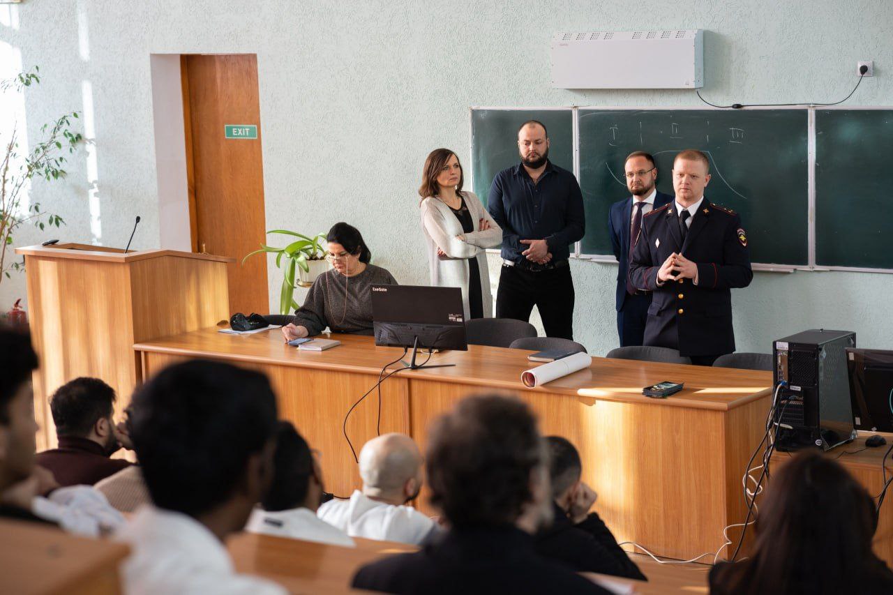 Сотрудник полиции поговорил с иностранными обучающимися о законодательстве Российской Федерации, запрещающем изображение и распространение экстремистской символики, предупредил об опасности, которую могут нести представители ряда субкультур, и рассказал о мерах реагирования в случае возникновения предпосылок к насильственным действия, угрозам и запугиванию. Также студенты были предупреждены об опасности вербовки иностранными спецслужбами.