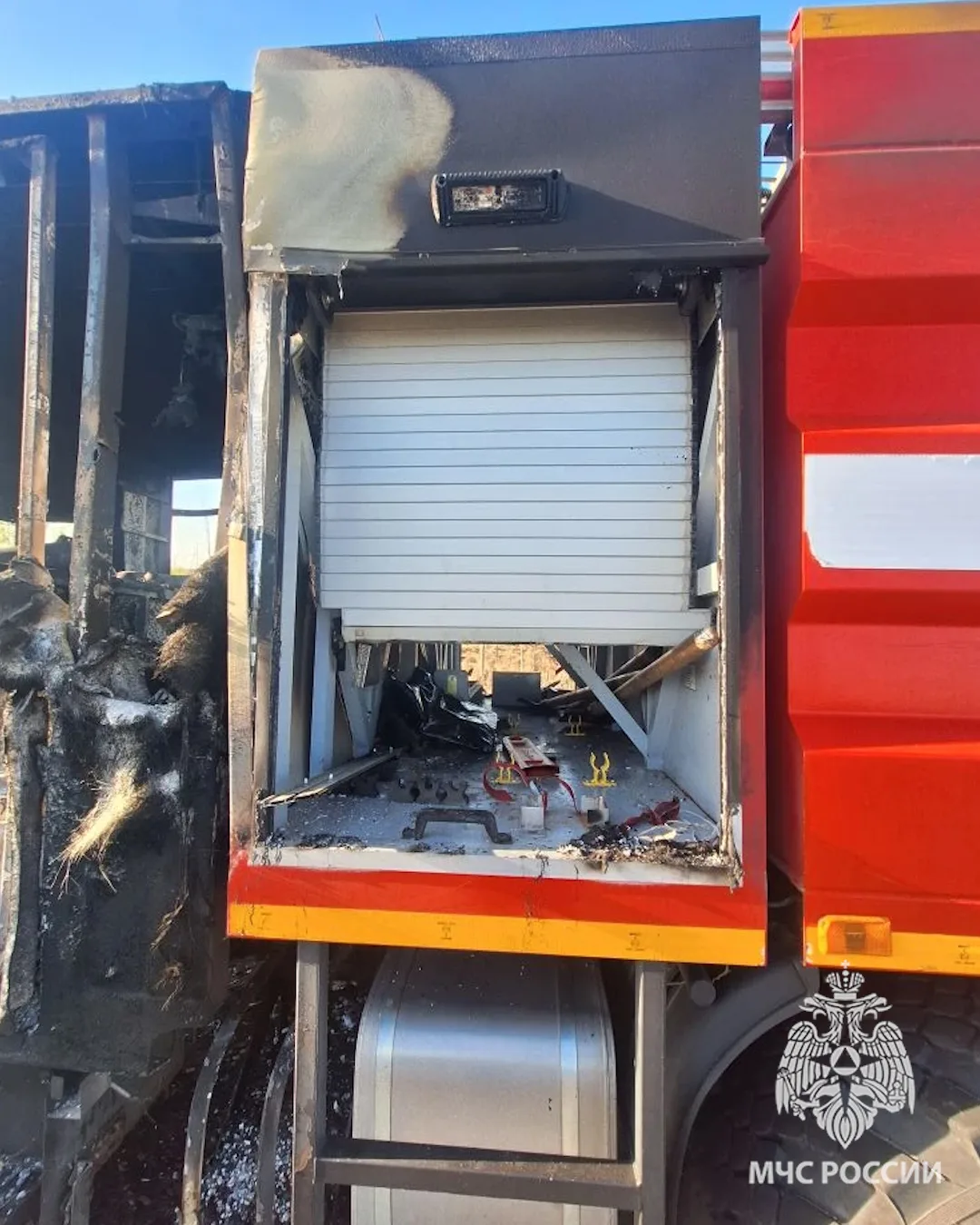 Техника МЧС России получила значительные повреждения - пожарная автоцистерна сгорела.