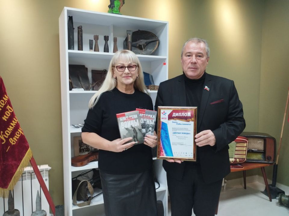 Депутат Народного Совета ЛНР Юрий Юров, координатор федерального проекта «Единая Россия» «Историческая память» по ЛНР поздравил директора Перевальского музея Ирину Мартынюк с региональной победой в Международном историческом диктанте на тему событий Великой Отечественной войны «Диктант Победы».