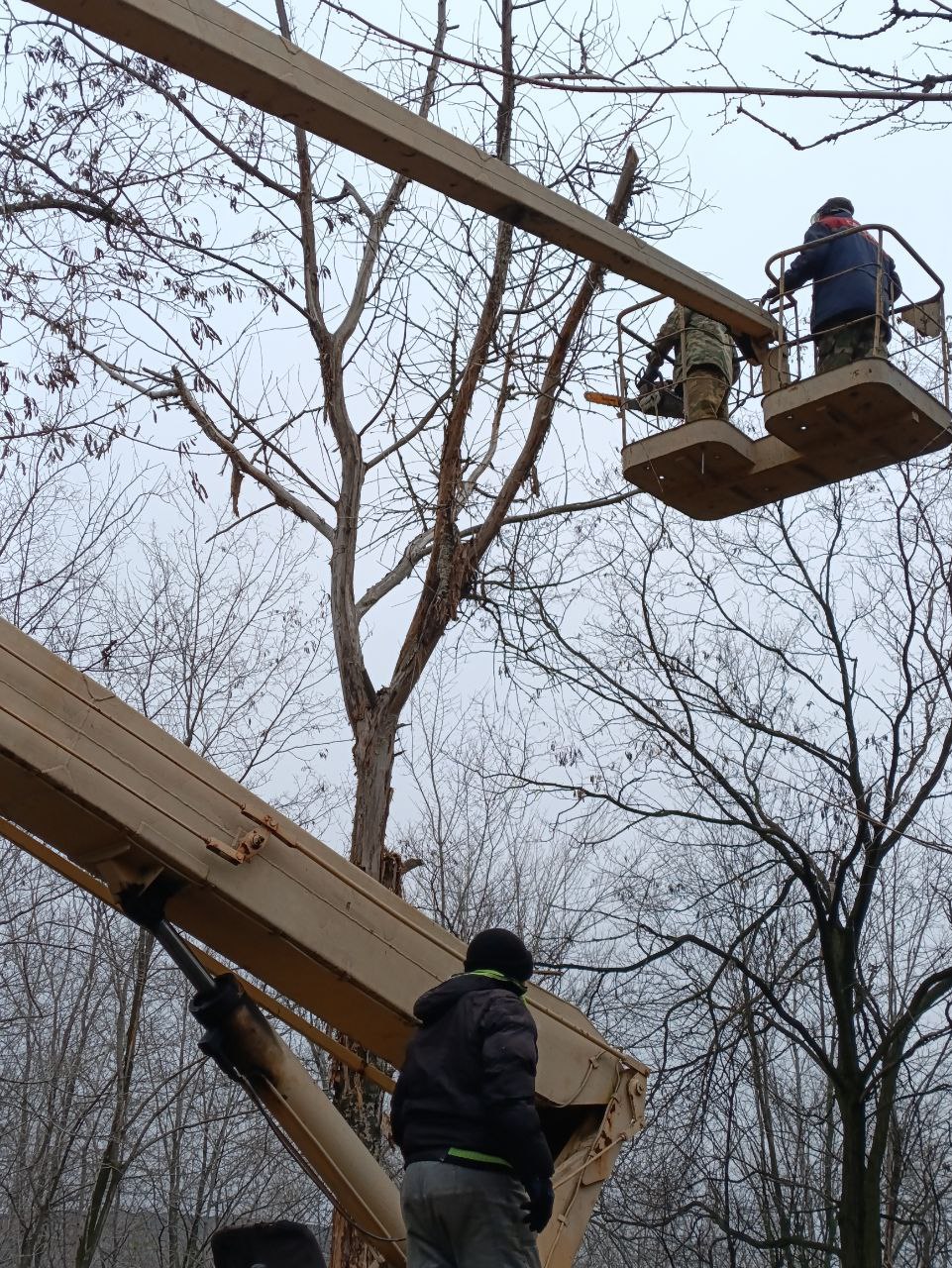 Задействовано: 5 работников (3 грузчика, 2 пильщика) и специализированная техника муниципального унитарного предприятия «СКАТ»: автовышка, фронтальный погрузчик и автомобиль «КАМАЗ».