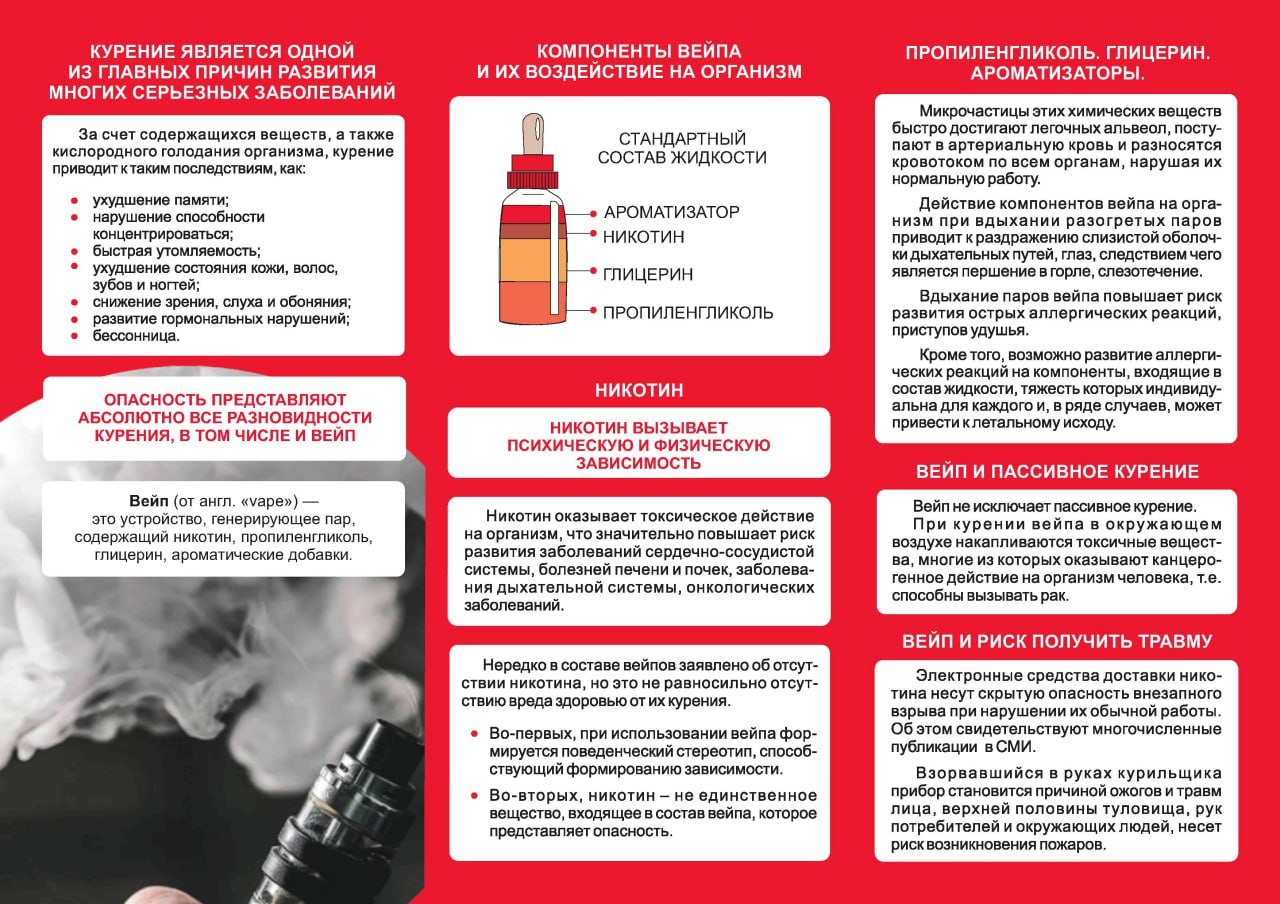 В жидкостях для вейпов содержатся тяжёлые металлы, другие химические вещества, попадание которых в организм в несколько раз повышает риск развития злокачественных новообразований. Токсичные пары вейпов способствуют образованию рубцов на легких и сужению дыхательных путей.