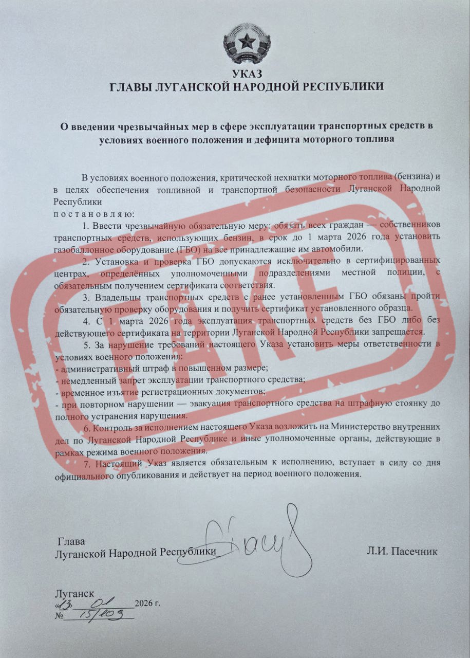 Некоторые Telegram-каналы распространяют фейковую информацию о якобы подписанном Главой ЛНР Леонидом Пасечником указе «О введении чрезвычайных мер в сфере эксплуатации транспортных средств в условиях военного положения».