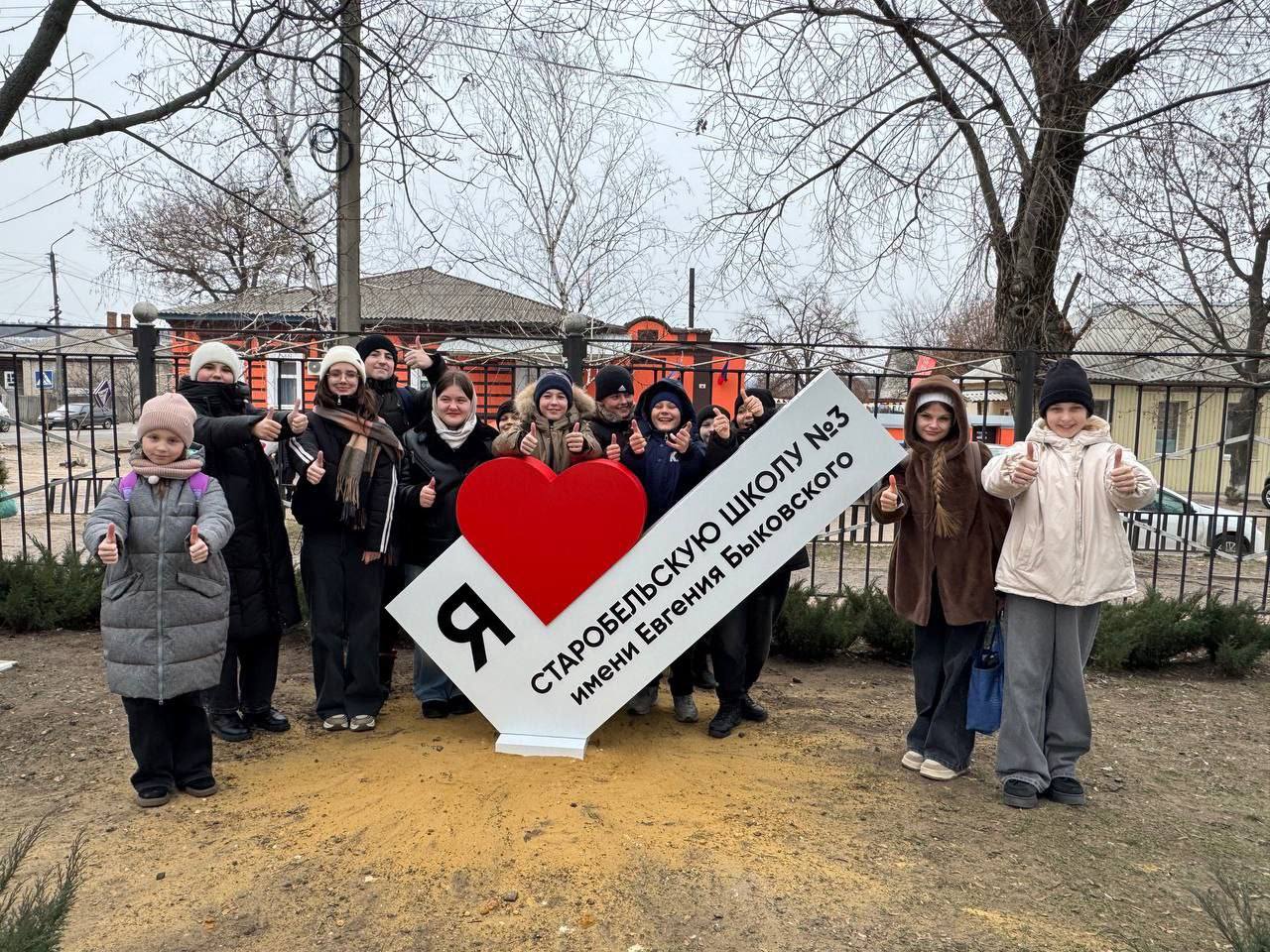 На фигуре в виде белой галочки красуется надпись «Я люблю Старобельскую школу № 3 имени Евгения Быковского», где слово «люблю» заменено алым сердцем, расположенным в самом центре композиции.