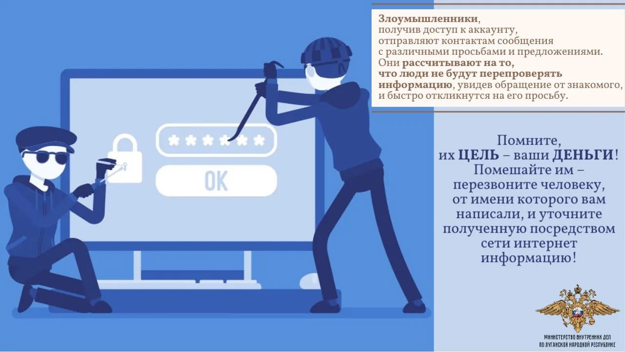 64-летней пенсионерке из Луганска в одной из социальных сетей поступило заманчивое предложение с аккаунта знакомой о возможности получить 13-ю пенсию. Решив не отказываться от денег, женщина отправила необходимые для оформления выплаты данные паспорта и банковской карты. В этот же день луганчанке поступил звонок на мобильный телефон от той самой знакомой, которая в разговоре рассказала, что её аккаунт был взломан неизвестными и, разумеется, все переписки ведутся неизвестными.