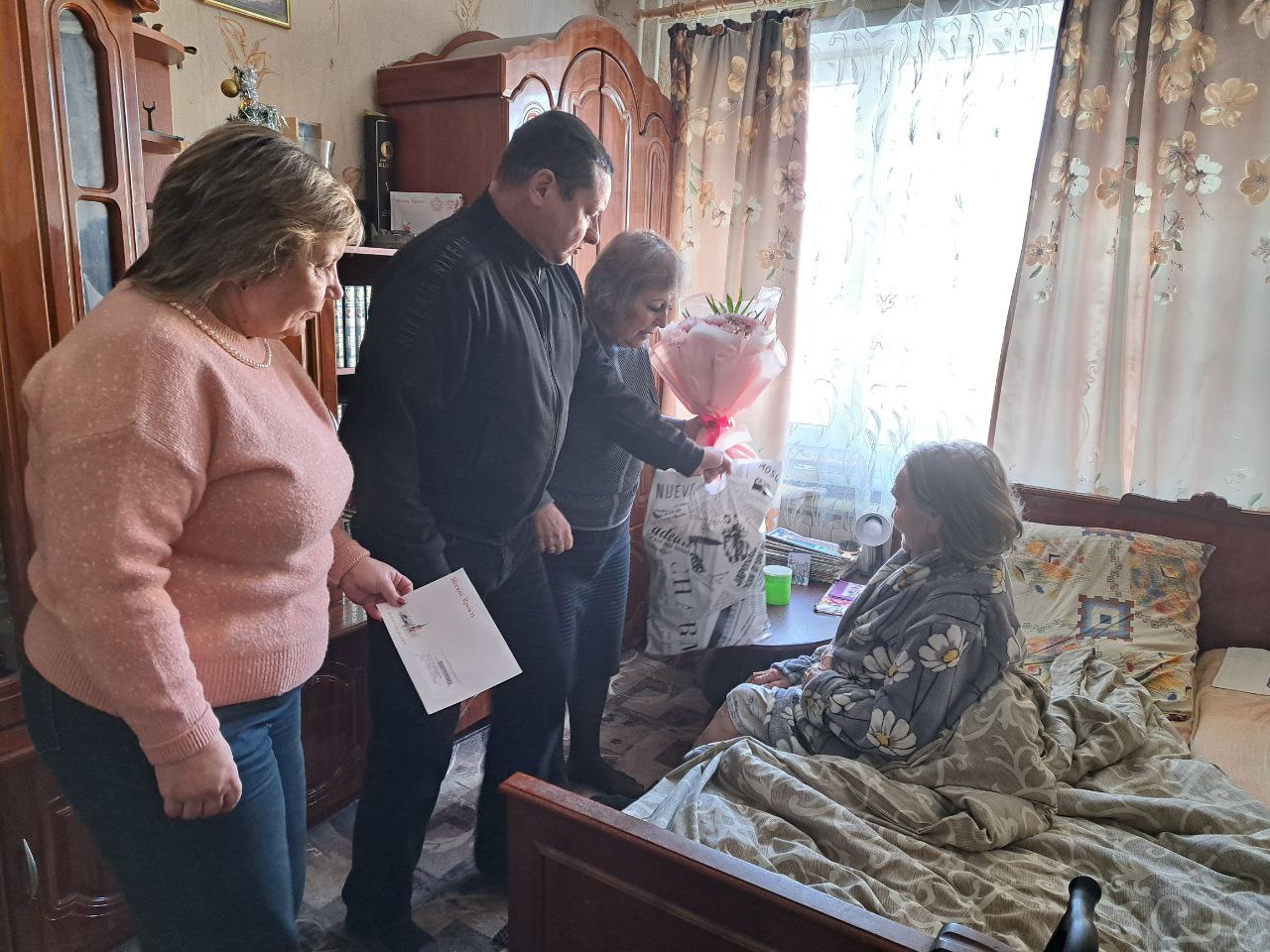 Сотрудники отдела жизнеобеспечения пгт Ясеновский Администрации городского округа город Ровеньки поздравили Анну Александровну с днем рождения, передали конверт с персональным поздравлением от Президента Российской Федерации, вручили букет цветов и продуктовый набор.