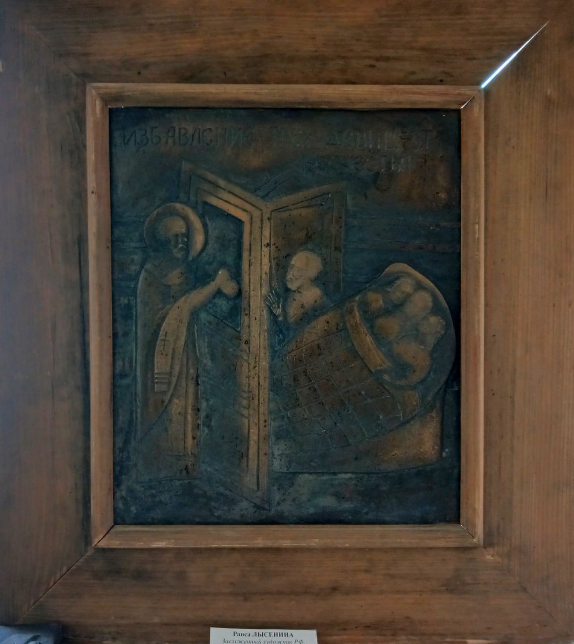 В поселке Солотча, что находится в 25км от Рязани, находится памятник Николаю Чудотворцу. Автором памятника-копии стала скульптор – Раиса Лысенина. Постамент украшен восемью клеймами, в которых отражены основные деяния Николая Чудотворца. Среди них – Клейма «Житие Св. Николая Чудотворца. Утешение бури». Такую же клейму автор изготовила и передала в дар для нашей Галереи искусств — как знак духовного и художественного единения, как мост между разными уголками нашей необъятной страны.