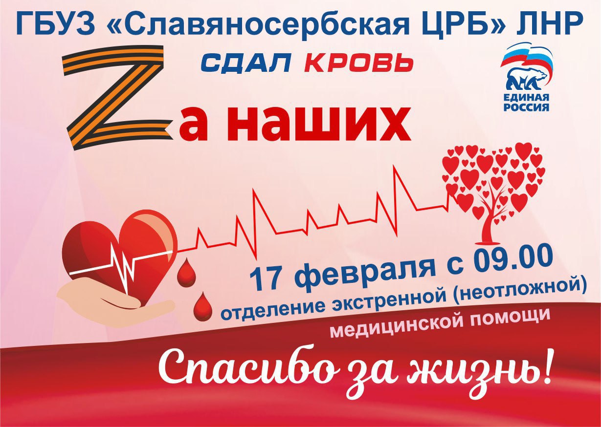 17 ФЕВРАЛЯ с 9.00 в помещениях отделения экстренной (неотложной) медицинской помощи (приемный покой) Славяносербской ЦРБ будет проводиться забор донорской крови. При себе необходимо иметь паспорт.