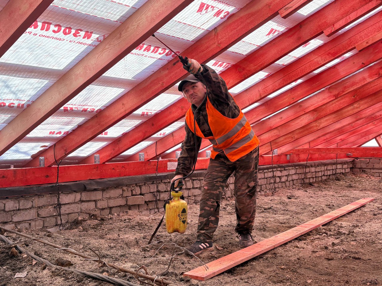Строители полностью завершили один из самых технически сложных этапов — монтаж стропильной системы крыши. На данный момент подрядчик ведет обработку деревянных перекрытий специальной огнеупорной смесью. Это не просто формальность, а важнейшая мера безопасности, которая обеспечит защиту здания от возгораний и продлит срок его службы.