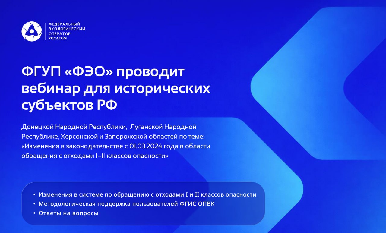 Министерство природных ресурсов и экологии Луганской Народной Республики напоминает природопользователям, что 18.03.2026 с 09:30 до 11:30 ФГУП «Федеральный экологический оператор» проведет вебинар на тему: «Изменения в законодательстве с 01.03.2024 в области обращения с отходами I–II классов опасности».