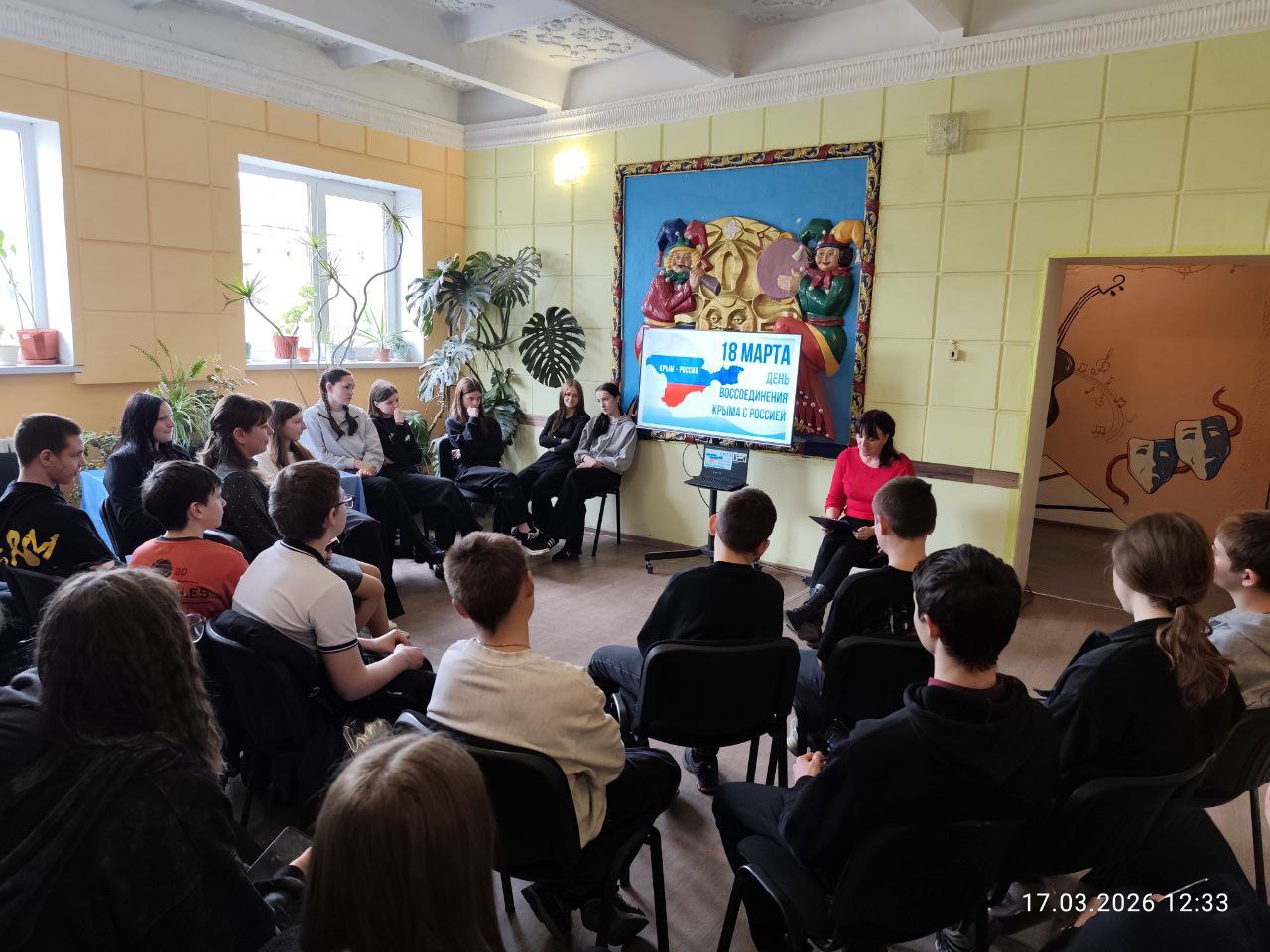 17 марта в Фащевском клубе "Горняк" для учащихся 7-х и 11-х классов Фащевской СШ № 24 прошел патриотический час, посвященный знаменательной дате – воссоединению Крыма с Россией.