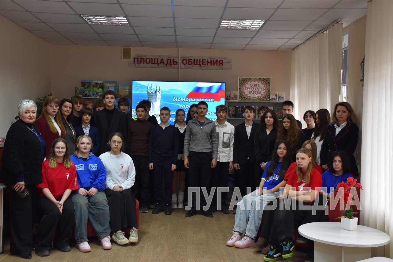 Ко Дню воссоединения Крыма с Россией в модельной библиотеке #БИБЛИОПРОСПЕКТ города Алчевска состоялось мероприятие – исторические зарисовки «Частичка России – прекрасный наш Крым». В нем принияли участие старшеклассники Алчевской социально-экономической гимназии, а также активисты «Движения Первых» и «Молодой гвардии».