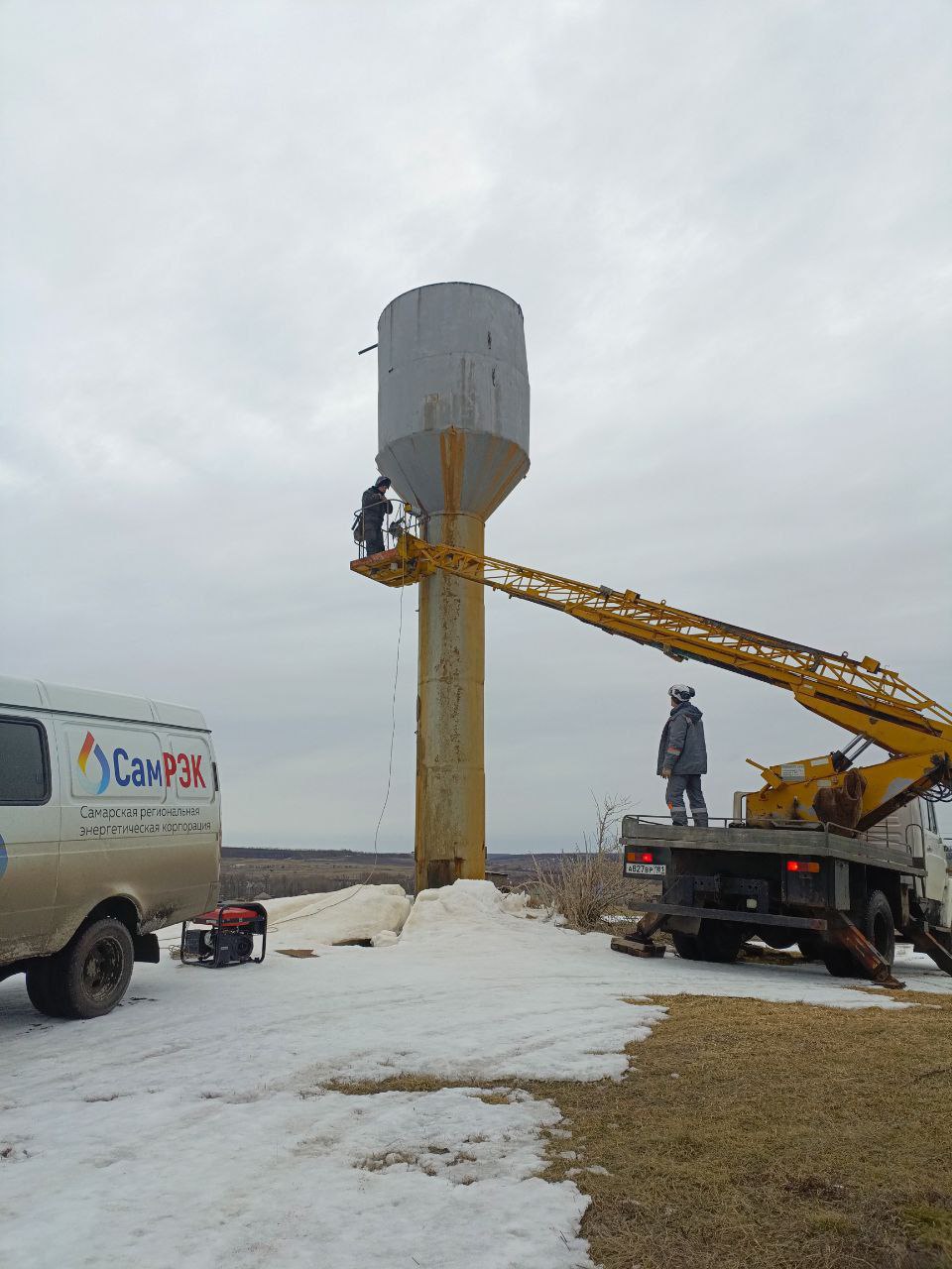 Специалисты сначала подготовили поверхность — провели очистку башен от рыхлой ржавчины и отслоившейся краски с помощью металлических щёток. Работа выполнялась локально, а потом уже провели сварочные работы — накладка латок на места протечек, образовавшихся в результате коррозии. Проведенные работы позволят продлить срок эксплуатации водонапорных башен.