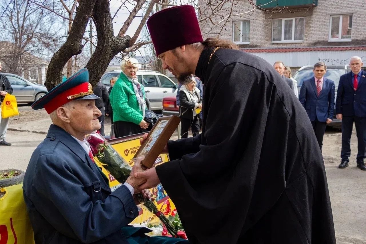 Сергей Ладик: От имени Героя России, генерал-лейтенанта Апти Ароновича Алаудинова, представители православного крыла спецназа "АХМАТ" МО РФ поздравили со 100-летним юбилеем ветерана Великой Отечественной войны, почётного гражданина города Луганска, Григория Пономаренко.