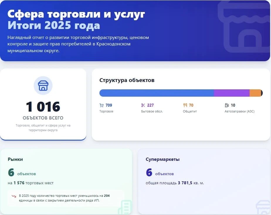 Наглядная инфографика, в которой собраны главные цифры и факты 2025 года: от структуры торговых объектов и открытия новых магазинов до результатов работы по контролю за ценами и защите прав потребителей.