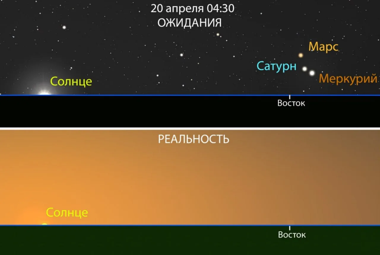 В СМИ и соцсетях пестрят новости, что 18 апреля Меркурий, Марс, Сатурн и Нептун выстроятся в линию. Увидеть этот космический "перформанс" смогут якобы жители Северного полушария.