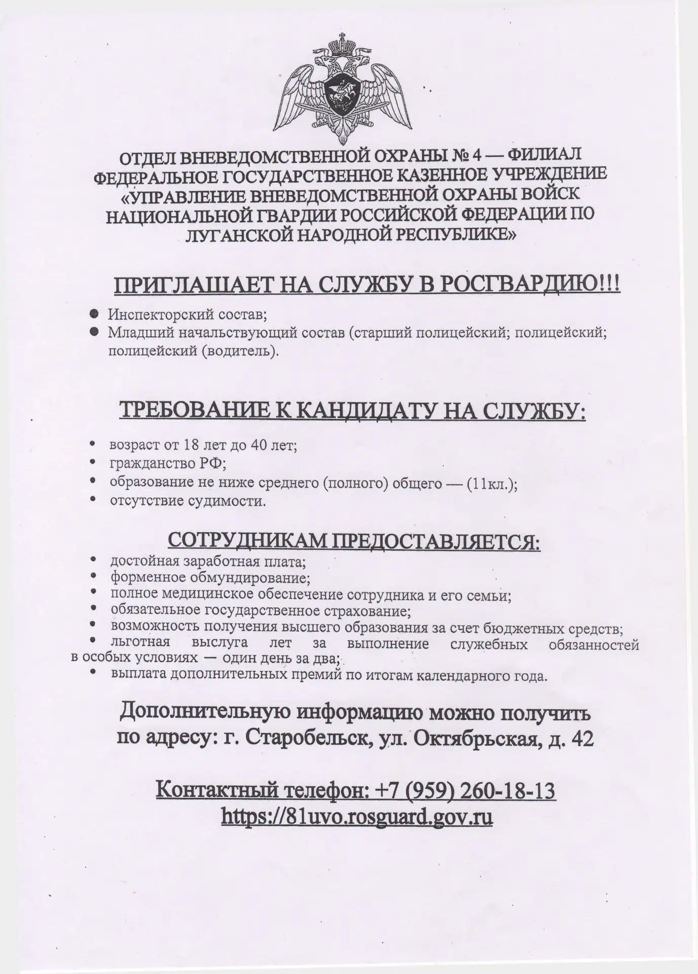 ОТДЕЛ ВНЕВЕДОМСТВЕННОЙ ОХРАНЫ № 4 — ФИЛИАЛ ФЕДЕРАЛЬНОЕ ГОСУДАРСТВЕННОЕ КАЗЕННОЕ УЧРЕЖДЕНИЕ «УПРАВЛЕНИЕ ВНЕВЕДОМСТВЕННОЙ ОХРАНЫ ВОЙСК НАЦИОНАЛЬНОЙ ГВАРДИИ РОССИЙСКОЙ ФЕДЕРАЦИИ ПО ЛУГАНСКОЙ НАРОДНОЙ РЕСПУБЛИКЕ» ПРИГЛАШАЕТ НА СЛУЖБУ В РОСГВАРДИЮ!!!