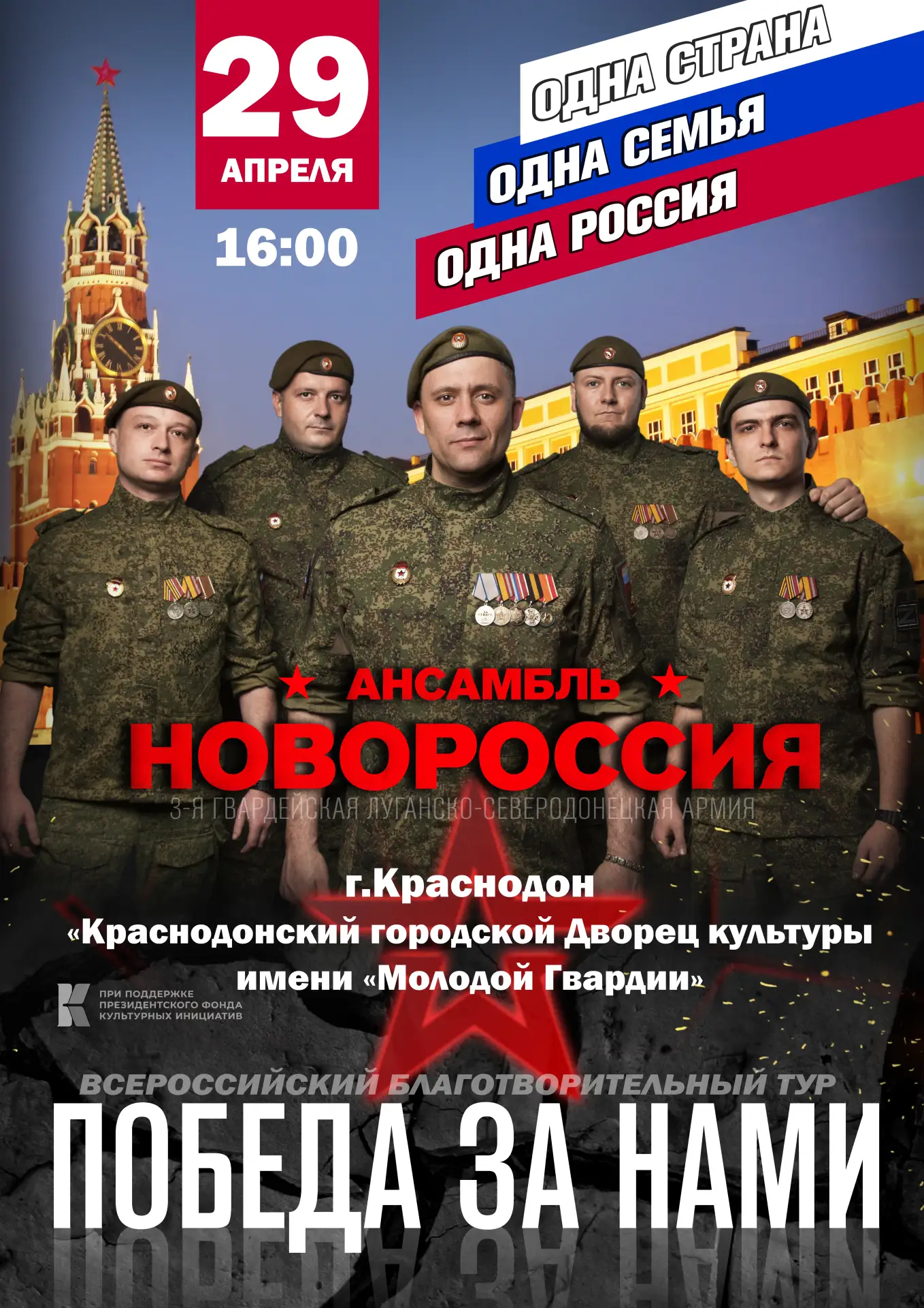 В рамках благотворительного тура «Победа за нами» ансамбль действующих военнослужащих 3-й гвардейской Луганско-Северодонецкой армии «Новороссия» выступит в Краснодоне.