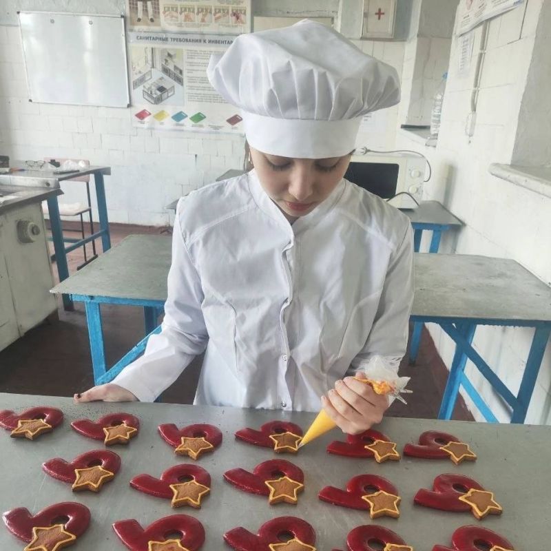 По инициативе председателя УИК № 335 Татьяны Могилевец студенты профессии «Повар, кондитер» ГБОУ СПО ЛНР «Ровеньковский горный колледж» под руководством опытных мастеров приготовили особенные сладкие сувениры — имбирные пряники, украшенные символами Великой Победы.
