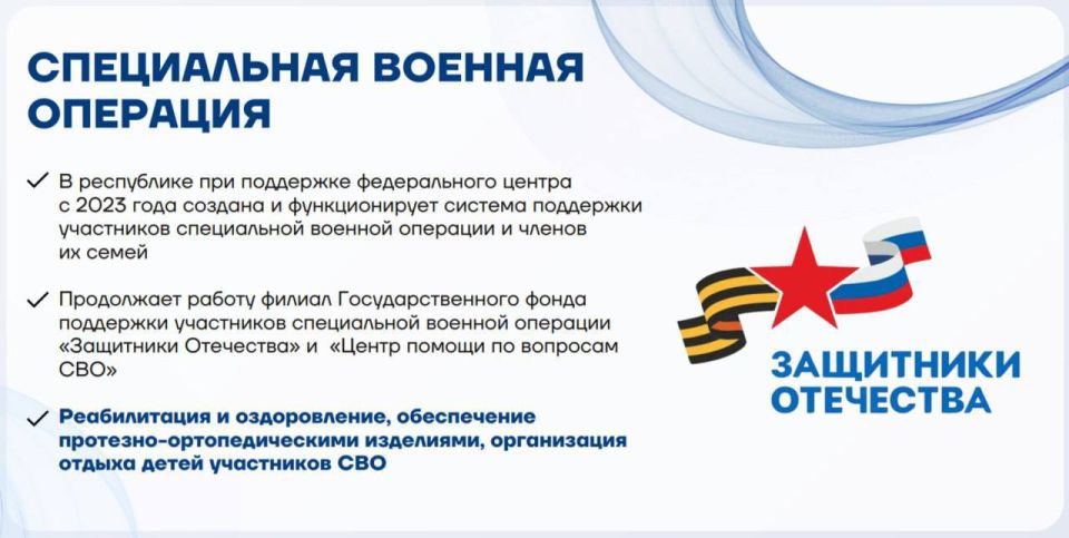 Нашим ребятам оказываются разнообразные меры поддержки, среди которых реабилитация и оздоровление после полученных ранений, обеспечение протезно-ортопедическими изделиями, организация отдыха, льготного обучения и питания детей из семей участников СВО. В 2024 году этой помощью воспользовались более 8 тысяч военнослужащих и их родственников. Немаловажной для них является и психологическая помощь. Будем работать над расширением мер поддержки.