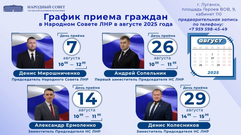 График приемов граждан Председателем Народного Совета Луганской Народной Республики и его заместителями в августе 2025 года