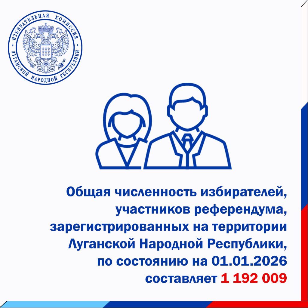 Общая численность избирателей, участников референдума, зарегистрированных на территории Луганской Народной Республики, по состоянию на 01.01.2026 составляет 1 192 009