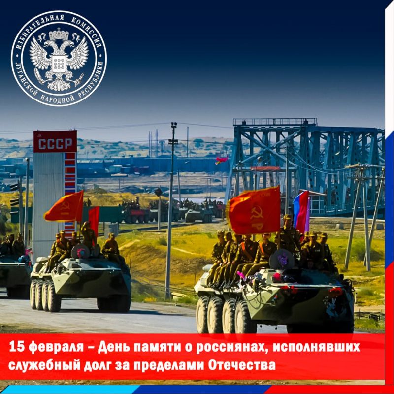 Избирательная комиссия Луганской Народной Республики призывает хранить память о соотечественниках, проявивших самоотверженность и преданность своей стране при исполнении служебного долга за её пределами.