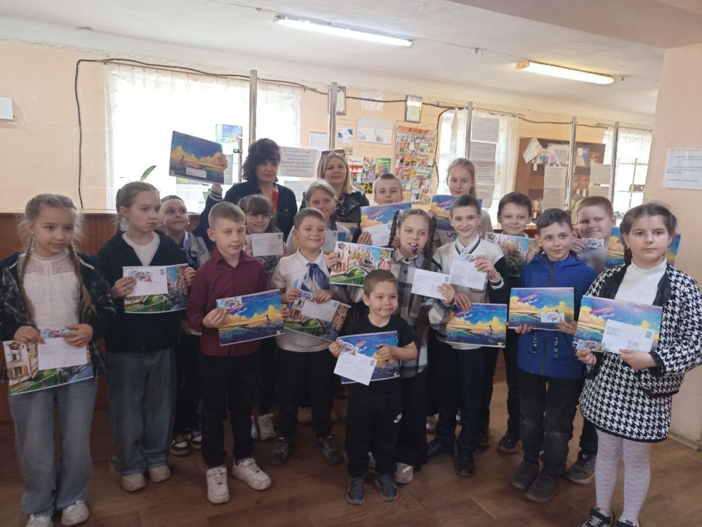Ребятам показали специальные юбилейные конверты, а также уникальные наборы открыток Муралы о защитниках Родины и Парк Горького, которые затем были переданы в школьный музей.