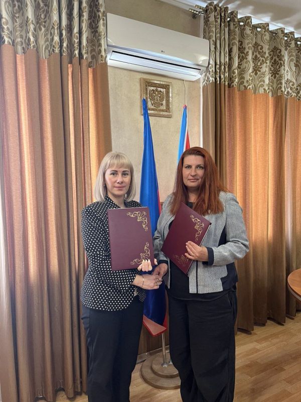 Директор Комитета семей воинов Отечества Луганской Народной Республики Юлия Кожевникова подписала соглашение о с уполномоченным по правам ребенка в ЛНР Инной Швенк