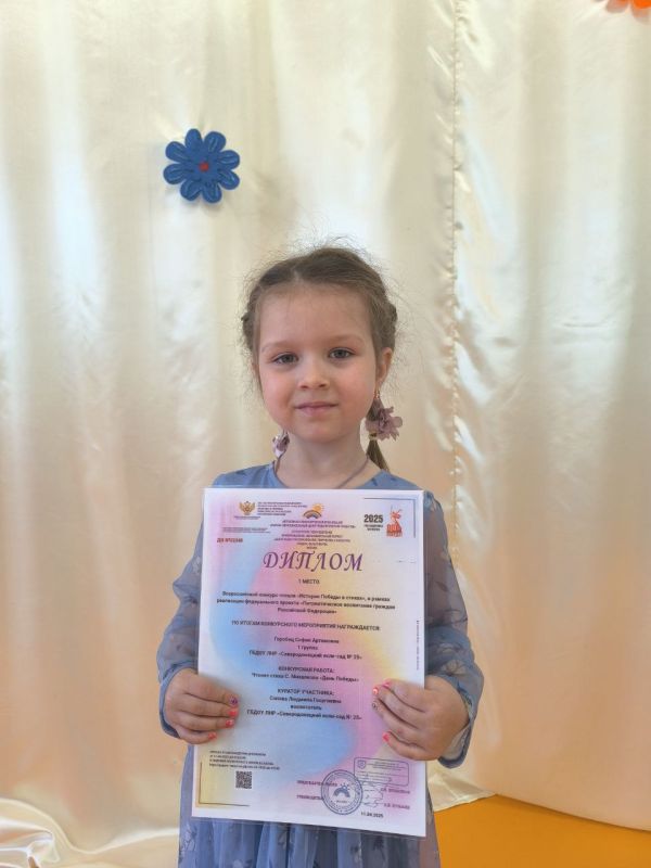 Горобец София, 1 место во Всероссийском конкурсе чтецов "История Победы в стихах", в рамках реализации федерального проекта "Патриотическое воспитание граждан Российской Федерации"