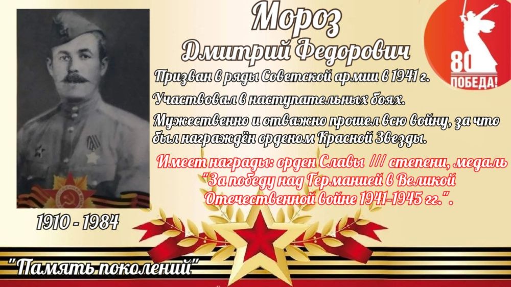Мороз Дмитрий Федорович, дедушка сотрудницы отделения МФЦ города Красный Луч Елены Цукановой-Бабченко, был призван в ряды Советской армии в 1941 году.