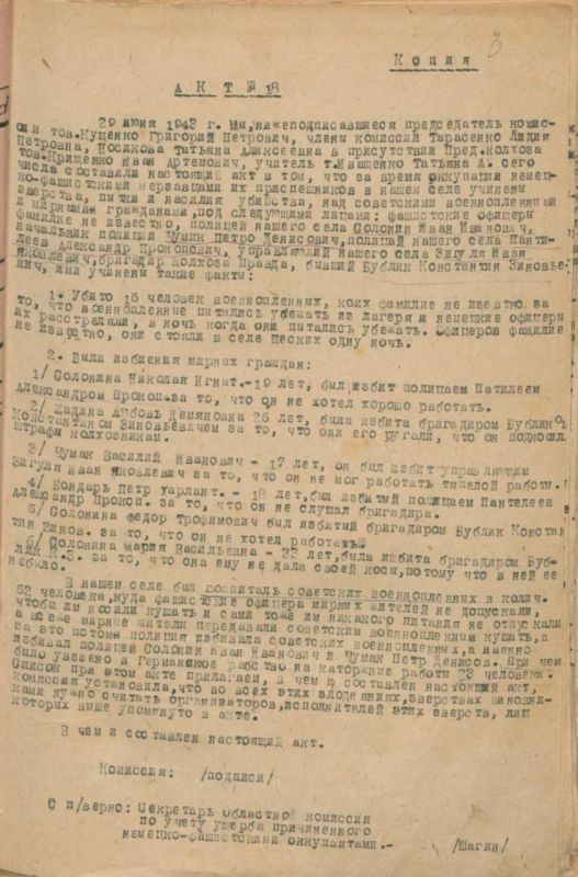 За время оккупации немецко-фашистскими мерзавцами их приспешниками в нашем селе учинены зверства, пытки, насилия и убийства над советскими военнопленными и мирными гражданами:1. Убито 15 человек военнопленных, коих фамилии неизвестны, за то, что военнопленные пытались убежать из лагеря и немецкие офицеры их расстреляли, в ночь когда они пытались убежать. Офицеров фамилии неизвестны, они стояли в селе Песких одну ночь.