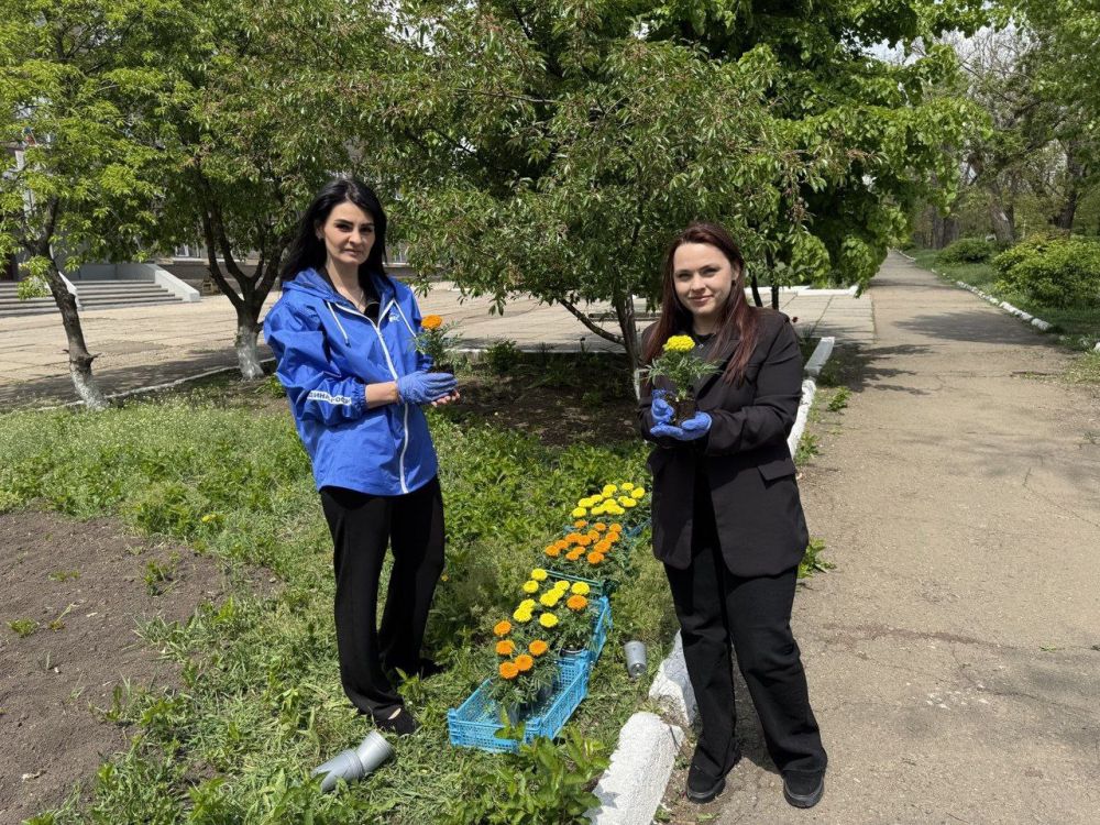При поддержке помощника депутата Ольги Халецкой активисты Женского движения вместе с обучающимися Краснолучской гимназия №1 имени Лилии Литвяк, активистами Молодой Гвардии Единой России и педагогами провели прекрасную экологическую акцию – высадили цветы на клумбе перед школой.