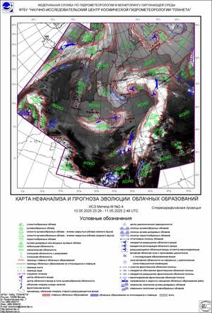 В период с 8 по 12 мая на европейской территории России (ЕТР) прослеживалось влияние системы атмосферных фронтов западных и южного циклонов. При этом южный циклон переместился по востоку Центрального на север Приволжского федеральных округов (ФО). На юге ЕТР отмечалось влияние системы атмосферных фронтов южного и Каспийского циклонов. Облачные системы атмосферных фронтов, связанные с циклонами, отчетливо прослеживается на карте нефанализа и монтаже спутниковых изображений, совмещенном с картой термобарического поля.