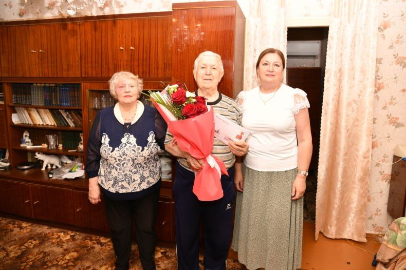 Татьяна Ивановна вручила юбиляру поздравительное письмо, прибывшее из Кремля от Президента Российской Федерации Владимира Владимировича Путина и букет цветов от Главы Свердловского муниципального округа Андрея Сухачева.