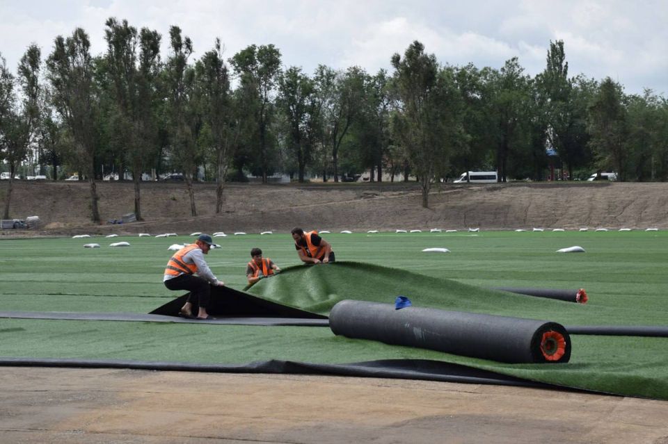 На этой неделе специалисты укладывали искусственный газон, его общая площадь целых 11 тыс. кв. м А рядом с искусственным - посеют свыше 20 тыс. кв. м натурального газона (на прилегающей территории).