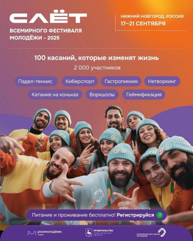 Масштабное международное молодёжное событие пройдёт в Нижнем Новгороде с 17 по 21 сентября 2025 года и объединит 2 000 молодых людей – 1 000 из России и 1 000 из-за рубежа. Регистрация была запущена в ходе празднования Дня рождения Всемирного фестиваля молодёжи и продлится до 20 июля 2025 года на сайте: https://clck.ru/3MgwTo