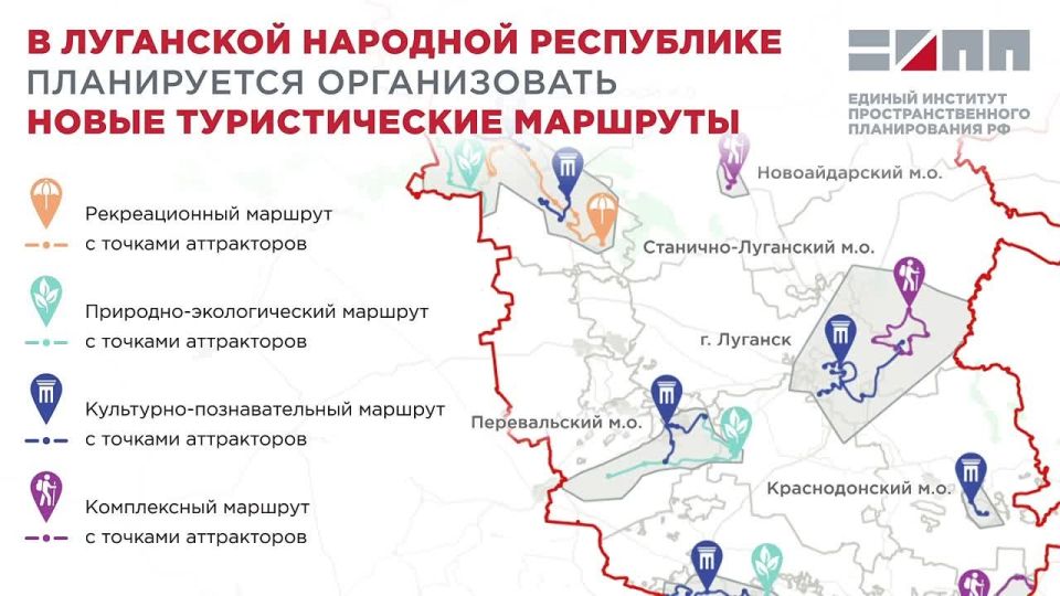 «Единый институт пространственного планирования РФ в рамках разработки комплексной схемы развития туризма Луганской Народной Республики предлагает создать рекреационный, природно-экологические, культурно-познавательные и комплексные маршруты, включающие главные туристические объекты. Рекреационный маршрут в городском округе города Северодонецк предполагает отдых у воды, занятия водными видами спорта, а также прогулочные маршруты вдоль озера Туба и реки Северский Донец», — проинформировали в ЕИПП.