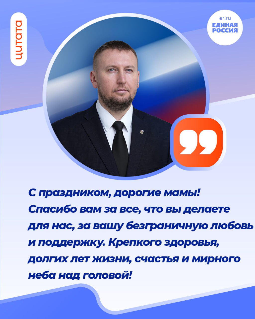 Секретарь Луганского регионального отделения партии «Единая Россия», Председатель Народного Совета ЛНР Денис Мирошниченко поздравил жительниц ЛНР с Днем матери.