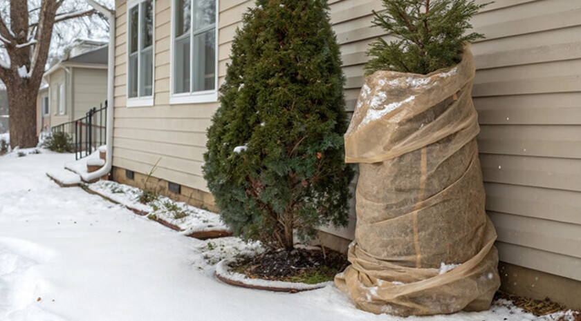 Зимой хвойные теряют влагу, а при сильном ветре или ярком солнце (особенно на южной и западной стороне) это может привести к «высыханию». Для защиты можно установить временные ветровые экраны из мешковины или агроволокна, особенно для молодых саженцев. Также есть препараты, снижающие испарение; применять их нужно строго по инструкции и не позднее чем за несколько недель до устойчивых морозов.