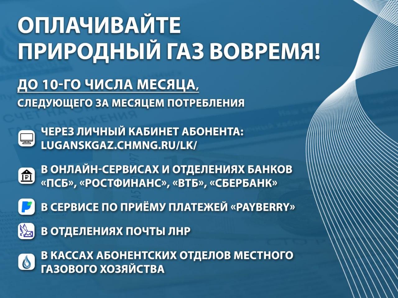 «Луганскгаз» филиал ООО «ЧМНГ» напоминает абонентам, что оплата за потребленный природный газ должна осуществляться в полном объеме ежемесячно, до 10-го числа месяца, следующего за месяцем потребления.