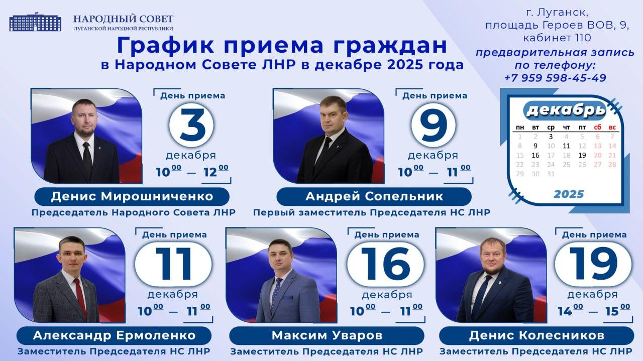 График приемов граждан Председателем Народного Совета Луганской Народной Республики и его заместителями в декабре 2025 года