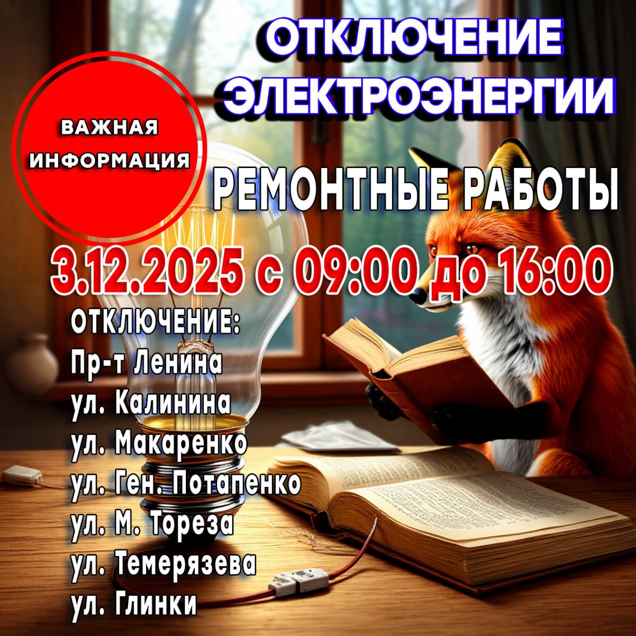 Администрация муниципального образования городской округ город Лисичанск Луганской Народной Республики информирует потребителей о плановом отключении электроэнергии в связи с ремонтными работами!