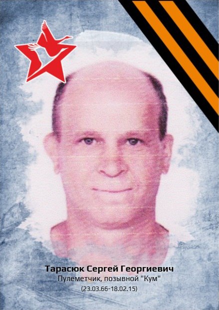 Тарасюк Сергей Георгиевич родился23 марта 1966 года в городе Ровеньки. До войны на Донбассе работал электрогазосварщиком в Ровеньковском коммунальном предприятии. Воспитывал двоих детей. После вступления, в августе 2014 года, в ряды Все великого Войска Донского принимал участие в боевых действиях по защите родного края. Позывной Сергея Георгиевича - «Кум». Тарасюк Сергей Георгиевич погиб 18 февраля 2015 года у «дебальцевского креста», закрыв собой двух бойцов подразделения во время минометного обстрела. 23 февраля 2015 года награжден медалью «За освобождение Дебальцево» (посмертно).