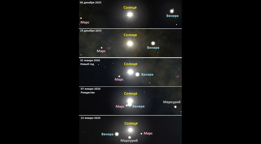 В канун Нового года расстояние между ними сократится до 2-3 градусов, а в ночь перед Рождеством (с 6 на 7 января) Солнце, Венера и Марс практически сольются на небе, напоминая Вифлеемскую звезду. В это же время появится и Меркурий, который сейчас меняет направление своего движения и начинает «догонять» Солнце.